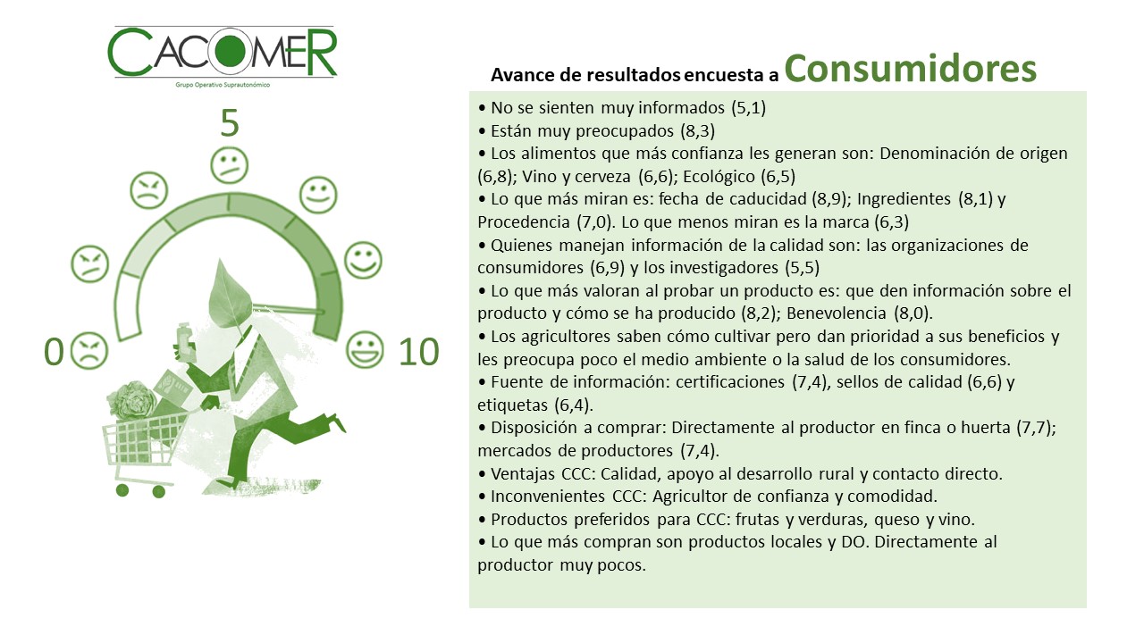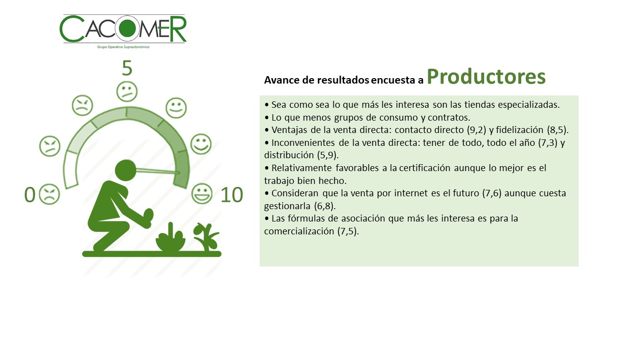 En esta primera fase del proyecto CACOMER se han lanzado en paralelo dos encuestas a productores y consumidores para analizar los diferentes modelos existentes con ánimo de hacer propuestas innovadoras en el proceso de comercialización, en herramientas basadas en las TIC y en modelos de logística para la compra-venta de productos agroalimentarios en canales cortos.